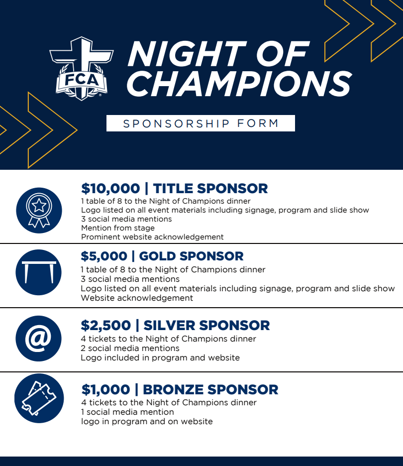 We’re thrilled to have you join us for an unforgettable evening in support of the Fellowship of Christian Athletes. Your presence at Night of Champions helps empower coaches and athletes to live out their faith boldly, on and off the field. Every donation, every story, and every moment are part of the impact you’re making.